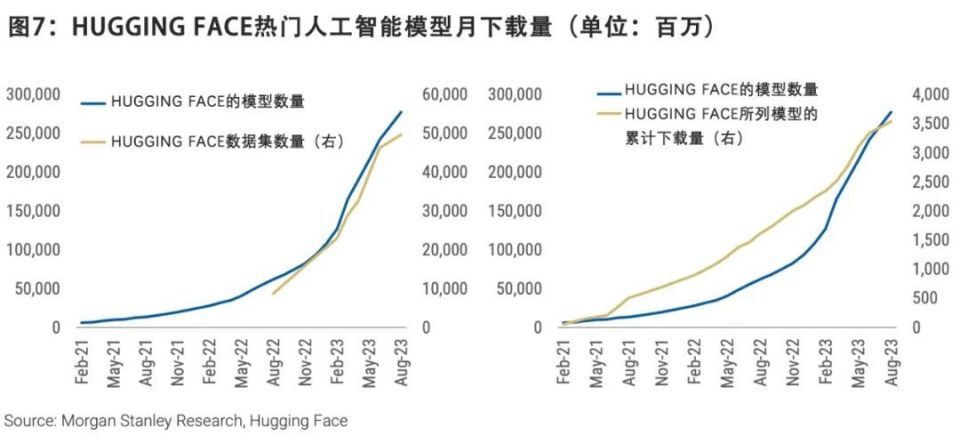 关键数据:作为最受欢迎的开源人工智能模型库,Hugging Face上人工智能模型的月下载量今年大幅飙升。从2021年1月到2023年8月,Hugging Face上排名前10的模型的下载量已达35亿。