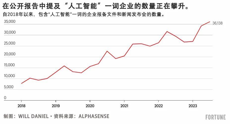 韦德布什(Wedbush)的科技分析师丹·艾夫斯也在6月详细介绍“人工智能淘金热”(AI gold rush)的报告中玩起了泡沫说。艾夫斯是首批将人工智能崛起与互联网泡沫初期进行对比的分析师。在人工智能时间线上,艾夫斯认为是1995年而不是1999年,这意味着这个泡沫在破灭之前还有很大的膨胀空间,而且投资者应该利用这一趋势。他认为,人们能够在企业营收电话会议和讲演里感受到了人工智能热。市场情报公司AlphaSense称,企业营收电话会议、新闻发布会和其他公开文件中提及“人工智能”一词的数量自2018年以来飙升了363%。具有讽刺意味的是,这家公司也在使用人工智能来挖掘财务数据里的信息。