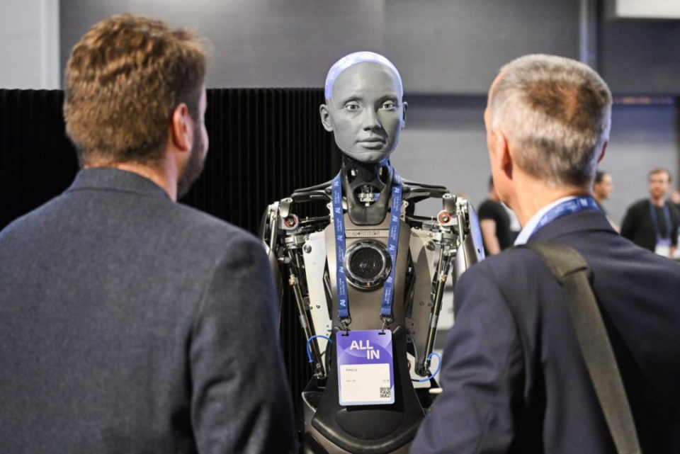 2023年9月27日,在加拿大魁北克省蒙特利尔举办的All In活动中,IVADO Labs展出的Engineered Arts Ameca机器人。图片来源:PHOTOGRAPHER: GRAHAM HUGHES/BLOOMBERG VIA GETTY IMAGES